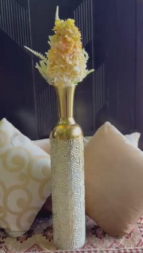 Enhance your home décor with this Elegant Gold Accented Floral Vase that offers a refined touch of class and sophistication. Standing tall, this vase features a stunning floral design on its base, blending a delicate white pattern with a gold accent for a luxurious finish. The vase is paired with beautiful pastel yellow flowers that offer an inviting and calming ambiance, adding a graceful touch to your living room, hallway, or bedroom.