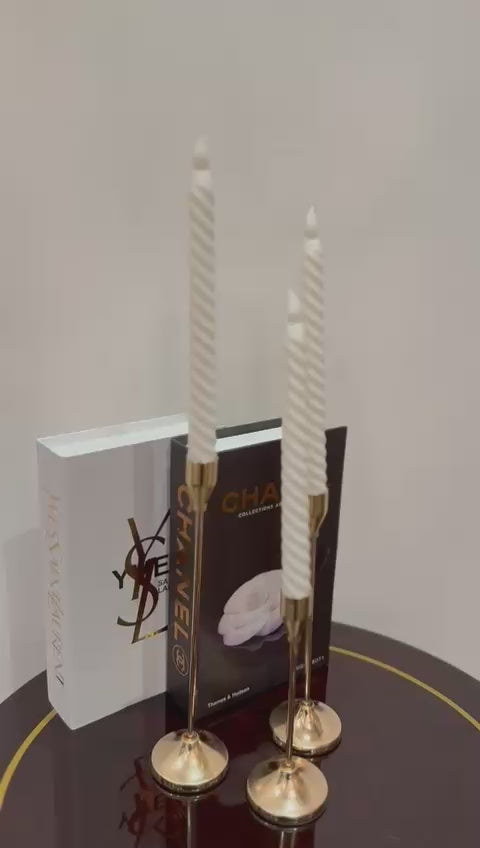 Crafted with care, the sleek gold design pairs beautifully with the classic white candles, creating a luxurious contrast that will elevate your dining table, mantle, or bedside table. The unique twist design adds a modern touch while maintaining a timeless appeal.